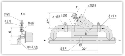 型號 管徑 (mm) 過濾流量 (m3/h) 過濾面積 (cm2) 排污閥DN (mm) 一次清洗水量(L) 電機功率 (KW) 重量 (Kg) D (mm) A (mm) B (mm) C (mm) C (mm) H (mm) L (mm) G (mm)