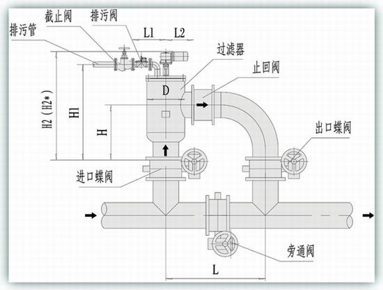 型號 管徑 (mm) 過濾 流量 (m3/h) 過濾 面積 (cm2) 排污 閥DN (mm) 一次清 洗水量 (L) 電機 功率 (KW) 重量 (Kg) D (mm) H (mm) H1 (mm) H2 (mm) H2 (mm) L1 (mm) L2 (mm) L (mm)