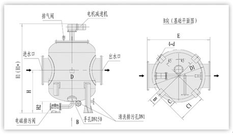 型號 管徑 mm 過濾 流量 m3/h 過濾面積 cm2 電磁排污閥DN1 mm 一次清洗水量L 清洗排污閥DN1 mm 電機功率 KW 重量 Kg D mm H mm H1 mm H1 mm H2 mm E mm D1 mm B mm C mm C1 mm D mm